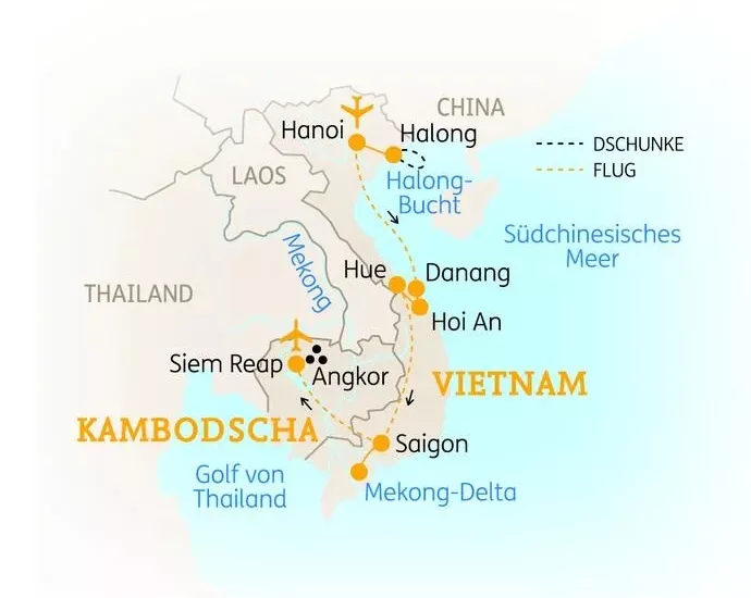 Faszinierende Städte, traumhafte Landschaften, geheimnisvolle Tempelanlagen, die eindrucksvolle Halong-Bucht sowie das Herzstück des alten Khmerreiches in Kambodscha, die Tempelanlage Angkor: Entdecken Sie bei dieser 15-tägigen Rundreise die wichtigsten Höhepunkte Vietnams und Kambodschas und lassen Sie sich von der Vielfalt der Region und der Gastfreundschaft der lokalen Bevölkerung verzaubern!