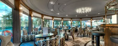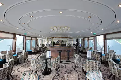 Elegante Räumlichkeiten auf 4 Passagierdecks verteilt. Stilvoll eingerichtete Panorama-Lounge mit Bar, Panorama-Restaurant ”Vier Jahreszeiten“, elegante Heckbar mit Außenterrasse, je nach Route auch mit à la carte-Restaurant. Atrium-Lobby mit Rezeption, Lift, kleine Boutique und Ausflugsbüro, Internetecke, Sauna, Dampfbad, kleiner Fitnessbereich, Friseur, Wäscheservice, großflächiges Sonnendeck mit kleinem Pool, Liegestühle und Sitzterrasse vorne sowie Barservice und kleine Aussichtsterrasse am Bug.