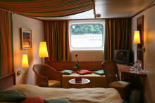 Großzügig geschnittene, komfortable Außenkabine. Elegantes Design und edle Materialien sorgen für Wohlfühlatmosphäre. Ausstattung: Safe, Klimaanlage, TV, Föhn, DU/WC, Saunatuch, Wolldecke, Telefon, Bademantel.
