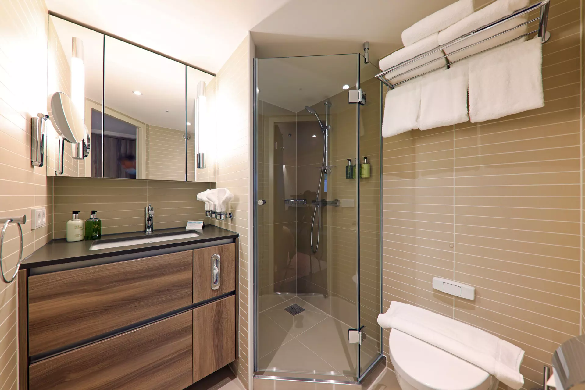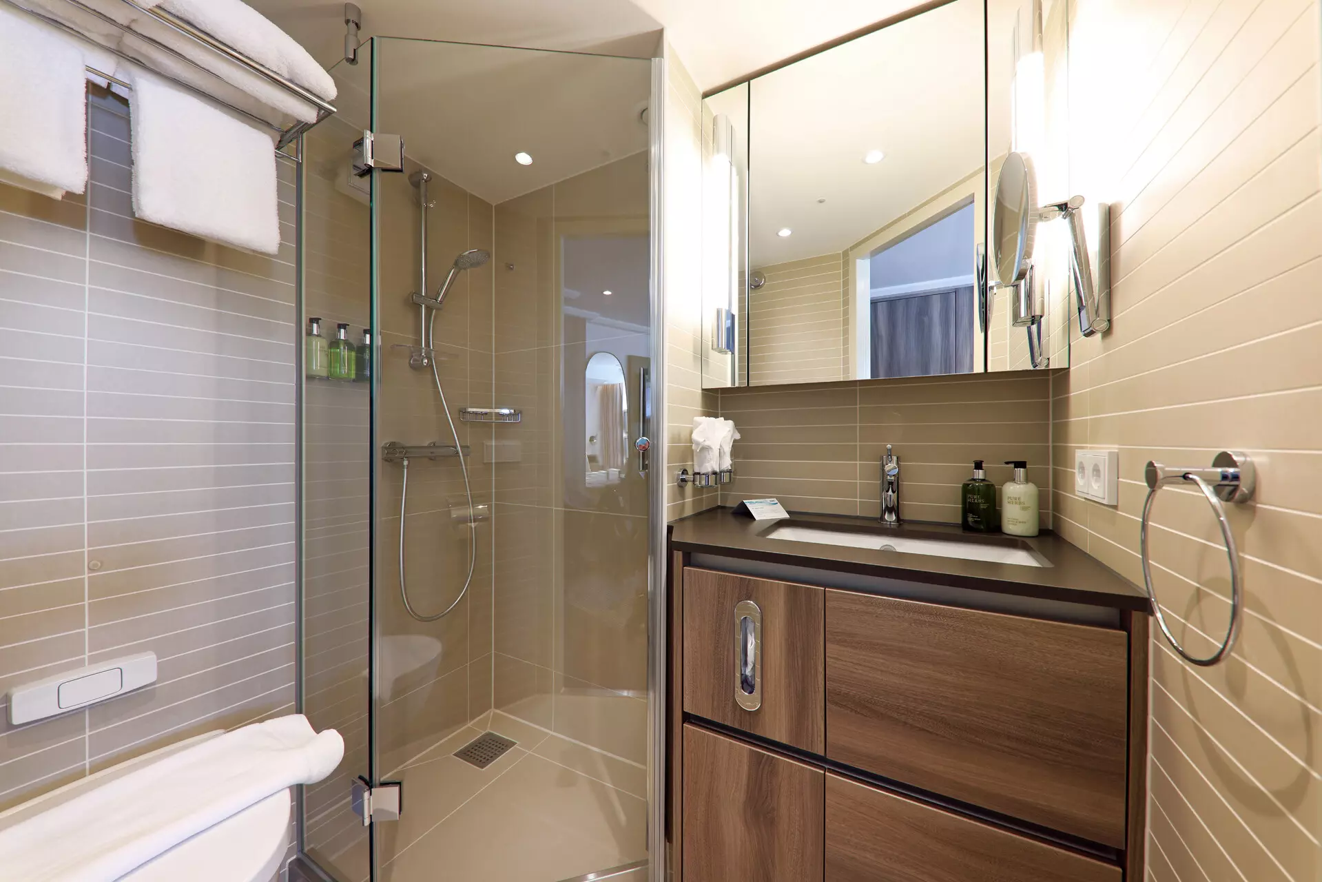 Ausstattung: Dusche/WC, Fön, individuell regulierbare Klimaanlage, SAT-TV, Radio, Kaffeemaschine, Minibar, Safe, Telefon, kleine Tageszeitung, Bordspannung 230 V Wechselstrom. Die Betten lassen sich wahlweise als Doppel- oder Einzelbetten stellen.