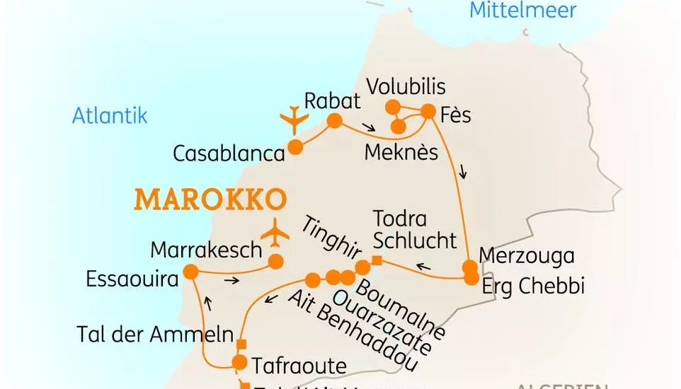 Casablanca/Rabat/Fes/Meknes/Tinerhir/Ouarzazate/Ait-Ben-Haddou/Essaouira/Marrakesch/Merzouga/Boumalne/Ourika/Tafraoute/Tiznit